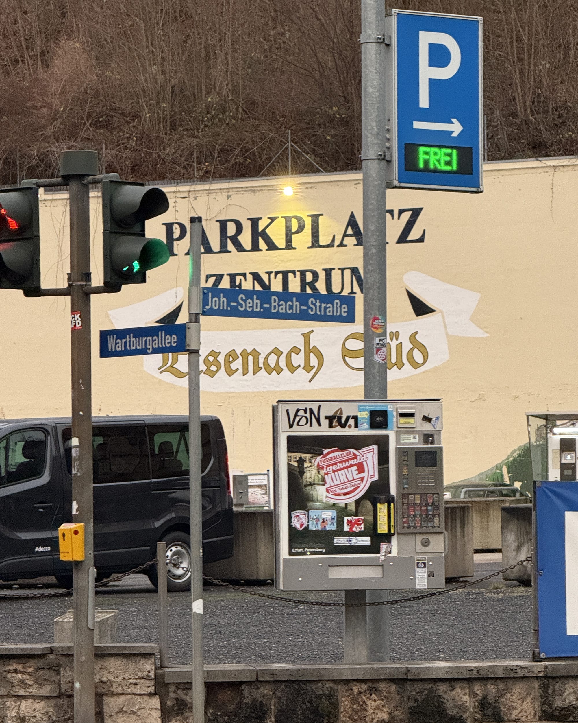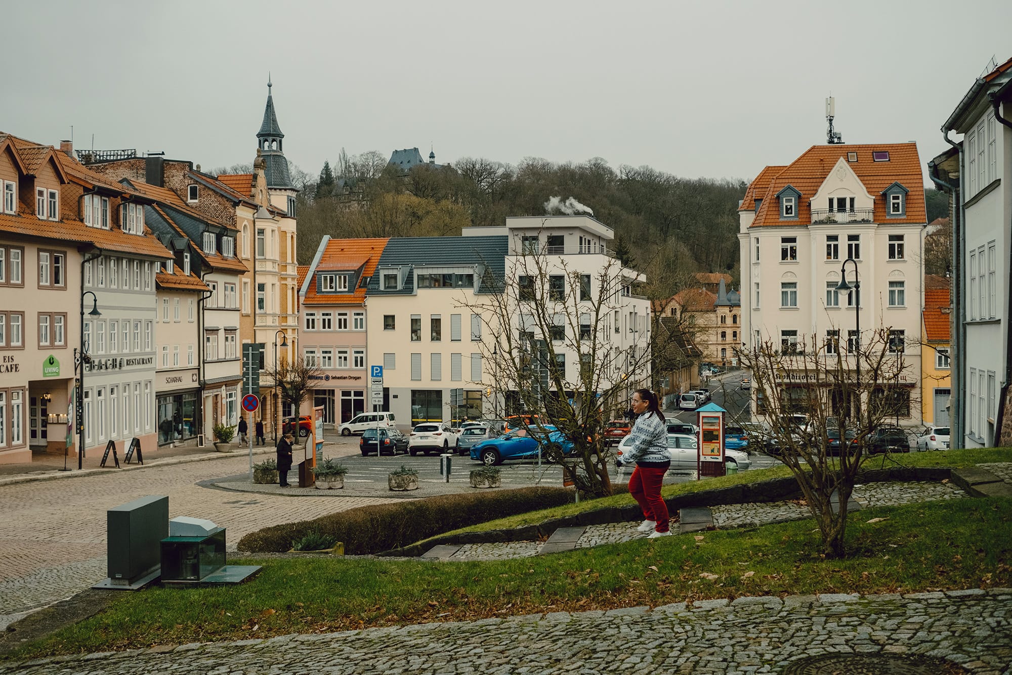 Reaching the gorgeous town sign really set the mood of this stop for us. We stayed at a beautiful hotel on the top of the hill called Berghotel Eisenach. In pictures, this property looks so green and magical. In the wintertime, it's perfectly misty, dark, and wet. We walked down the hill to the town center a couple times, which was a nice workout for all of us with all the hills and steps. But for dinner and an evening show at the Bachhaus, we opted to do the short drive down the hill instead.